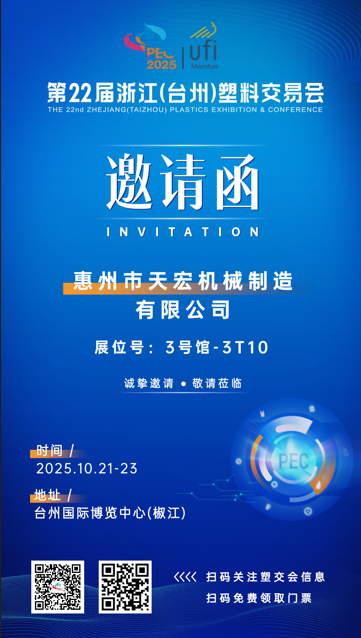 我們誠(chéng)摯邀請(qǐng)您于2025 年 10 月 21 日 - 23 日,蒞臨第 22 屆浙江(臺(tái)州)塑料交易會(huì)。我司展位號(hào)為3T10,屆時(shí)將有專業(yè)團(tuán)隊(duì)為您詳細(xì)介紹產(chǎn)品特性、應(yīng)用場(chǎng)景及合作模式,竭誠(chéng)歡迎您前來(lái)參觀指導(dǎo)、洽談業(yè)務(wù),共敘友誼、共謀發(fā)展!